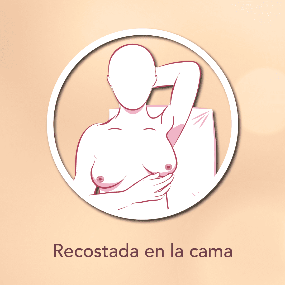 Acuéstate y con una almohada pequeña o toalla enrollada debajo del hombro derecho, pon la mano derecha en la nuca, con la mano izquierda revisa la mama derecha, y con el mismo procedimiento pero con la mano derecha revisa la mama izquierda.