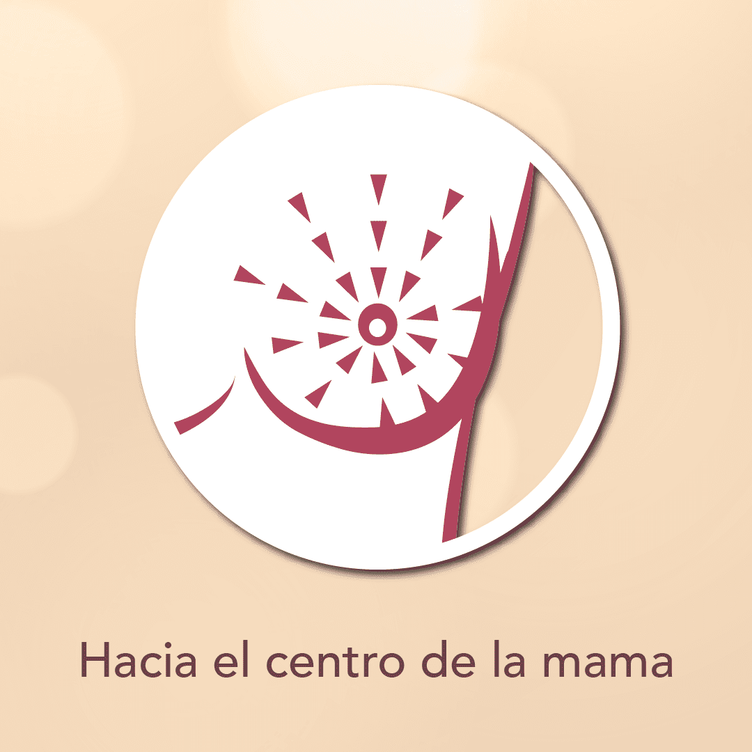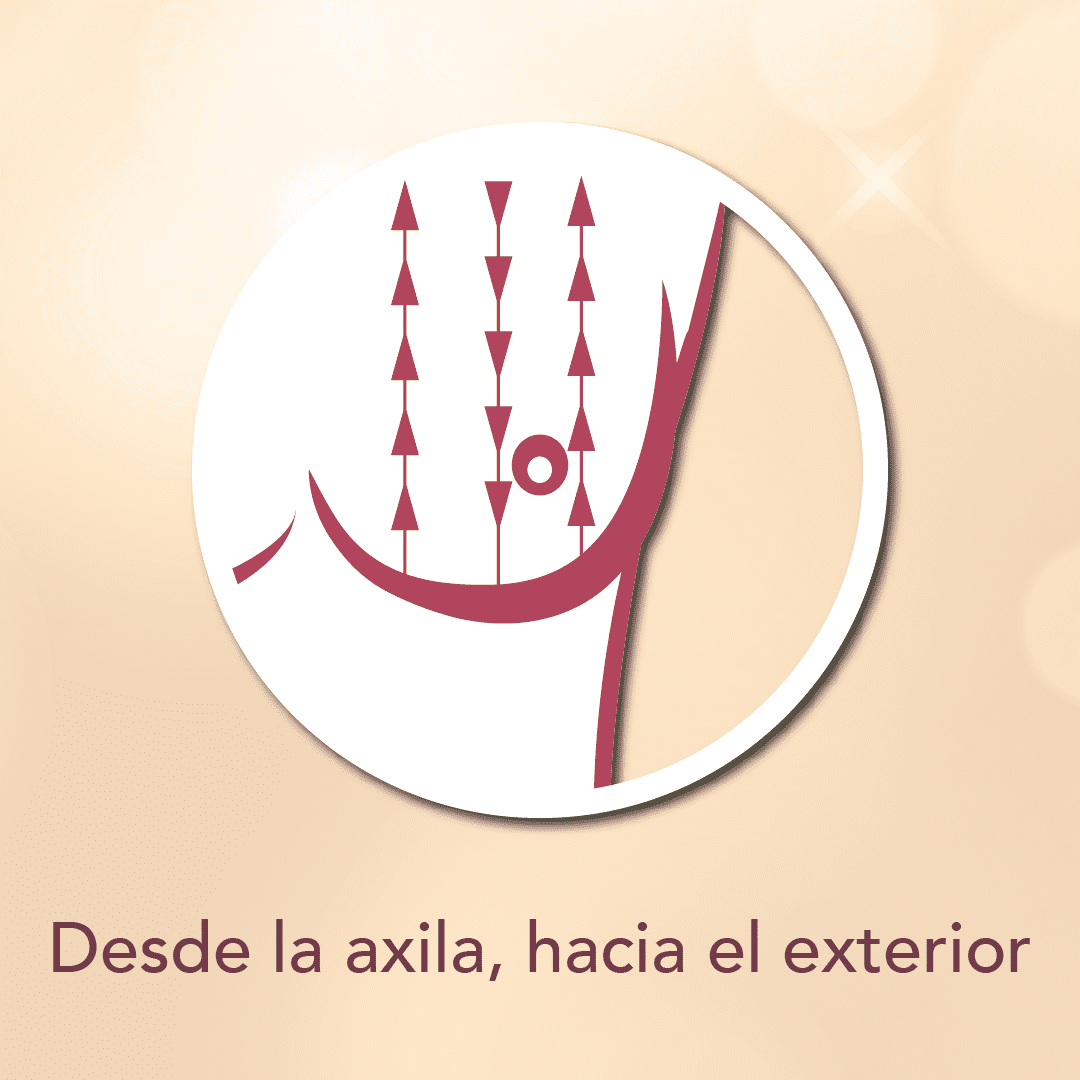 Revisa la mama completa de arriba a abajo y de lado a lado: desde la clavícula hasta la parte superior del abdomen, y desde la axila hasta el escote.
